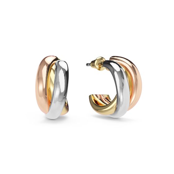 The Radiance Hoop Huggies are plated in a combination of classic gold, a modern edge of cool rhodium and a warm, feminine touch of rose gold and hand set with a channel of finest crystals.